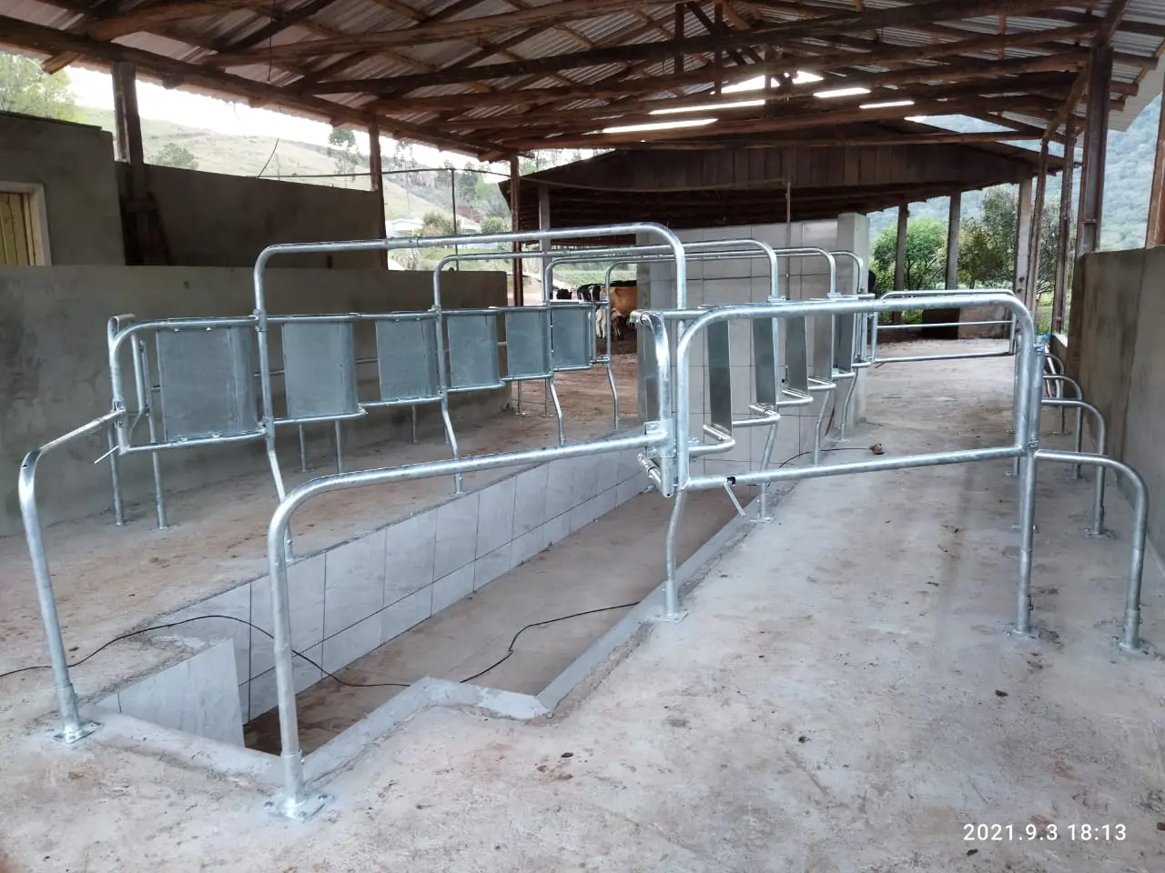 ● Largura de contenção de 0,80 m; ● Chapa de encosto traseira; ● Estrutura metálica galvanizada; ● Projeto compatível com ordenha traseira; ● Segurança para operador e animal.